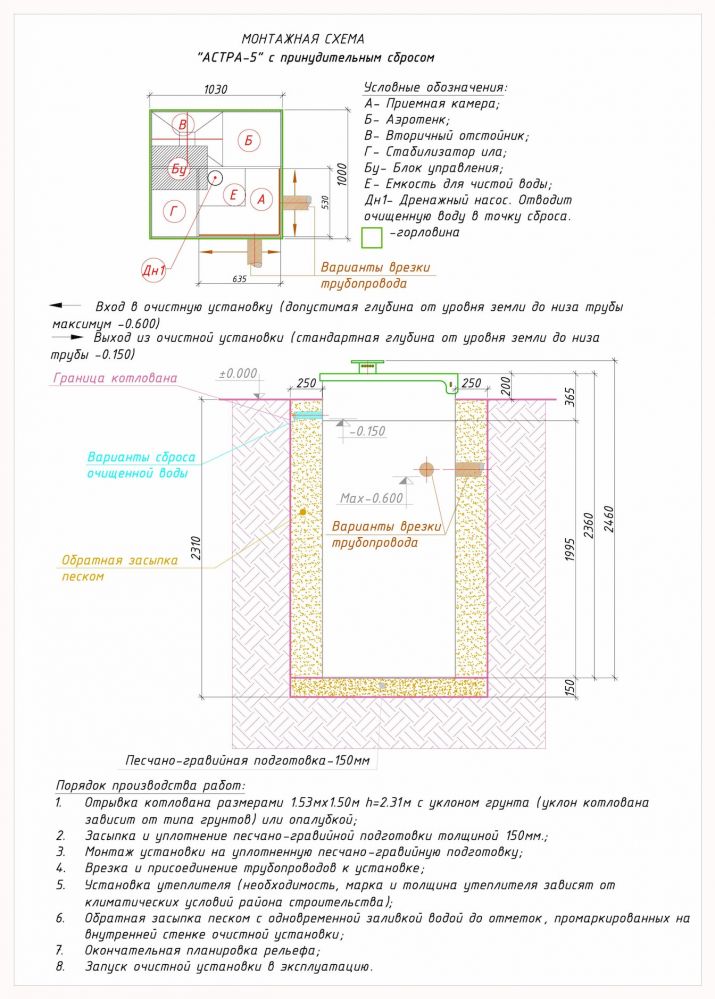 • При опускании Юнилос Астра 5ПР в подготовленный котлован между стенками станции и котлована образуются зазоры, требующие засыпки песком при последовательном наполнении емкости водой.